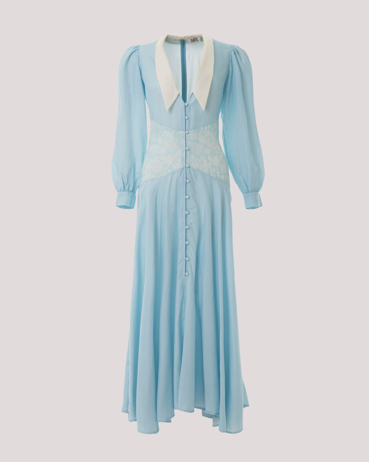 Through homespun charm and understated elegance, Margaretta is for the flowers, the fields, and vast landscapes. Characterized by its modest yet feminine silhouette, a deep V neckline is contrasted with a dramatic collar. Its fitted bodice with the sheer beauty of unlined fabric. Its gently flared skirt falls at the ankle for early mornings in Thorn or cheese runs in the Bel Paese.